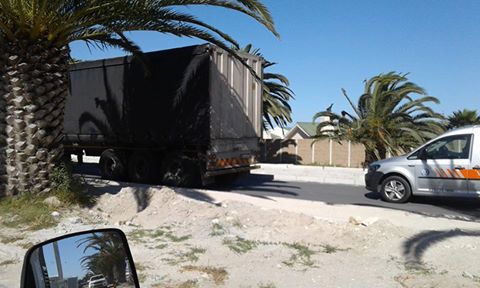 Traffic officials tried in vain to re-direct traffic this morning. Although the truck was parked against the pavement, no vehicle could pass it on the narrow road. It was agreed then that the entrance to Swemmer Park will have to be widened by removing a part of the pavement and one of the decorative palm trees, but that will still not solve the exit problem.