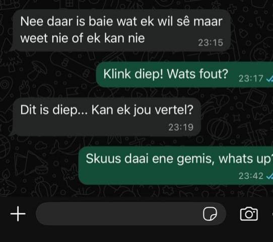 ‘n Whatsapp-gesprek wat Mari Hoon op die betrokke aand vanaf 22:29 tot 23:19 met ‘n familievriend in Pretoria gevoer het, druis ook lynreg in teen Stephan du Plessis se tydlyn en die algemene veronderstelling wat in die hof geskep is dat Jéan omstreeks 20:30 gaan stort het en dat Mari hom ‘n tydjie later gevolg het en albei in die stort deur koolstofmonoksied oorval en vergiftig is. Dit sou beteken het dat die paartjie drie uur lank gestort het?